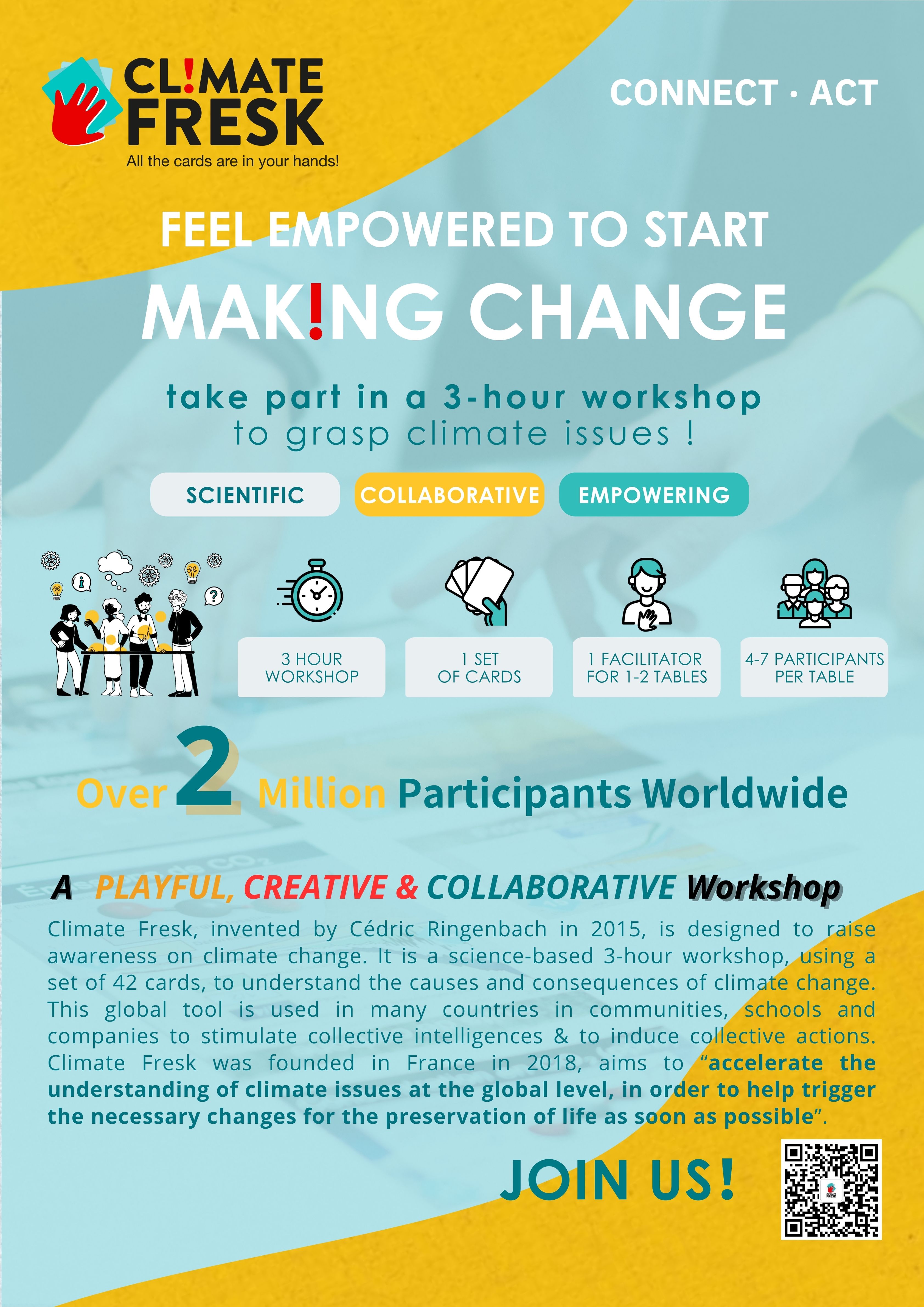 Climate Fresk, a science-based workshop to understand the causes and consequences of climate change, aims to “accelerate the understanding of climate issues at the global level, in order to help trigger the necessary changes for the preservation of life as soon as possible”. Based on United Nations Intergovemental Panel of Climate Change (UNIPCC), the workshop explains the patterns and the consequences of the disruption. Whether new to climate issues or climate experts, it will help improve your awareness and understanding of climate change. This global tool is used in many countries in communities, schools and companies to stimulate collective intelligences & to induce collective actions.