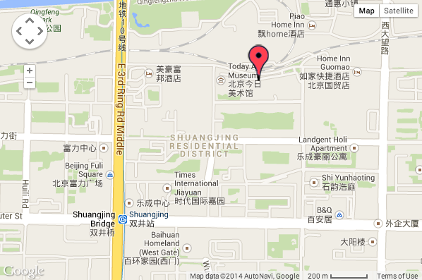 Shaungjing Station, Exit B1. Walk north, about 600m, turn right on Baiziwan Road, walk another 600m, past the Today Art Museum, until a row of black buildings. Look for Block 2A, 16th fl. Except about 20-25 mins for the walk.