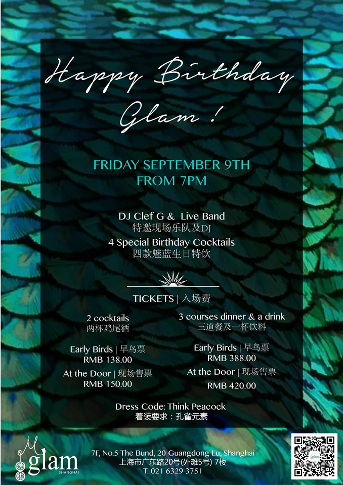 Glam is celebrating its 1st birthday with a live band, DJ set, special birthday drink menu...andall things Glam. Come dressed to the nines (it is 9/9 after all...), get ready to strut your stuff and let your inner peacock shine!