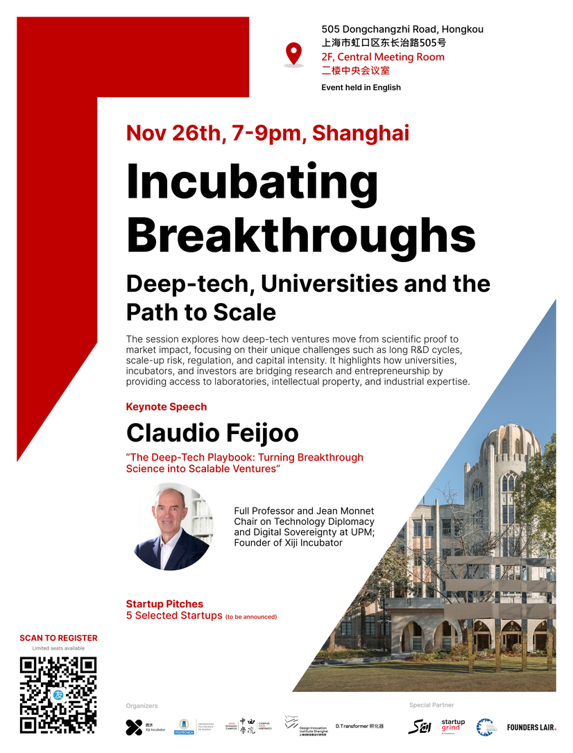 This event is part of a startup-focused series at the intersection of innovation, entrepreneurship, and global collaboration. It will feature 5 startup pitches and a keynote speech by Claudio Feijoo, Full Professor at the Technical University of Madrid (UPM), Jean Monnet Chair on Technology Diplomacy and Digital Sovereignty, and Founder of Xiji Incubator in Shanghai.
