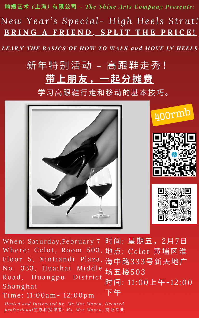 Due to the physical nature of dance activities, participants are required to confirm that they are in good health with no pre-existing conditions that may be aggravated by such exercise and agree to assume personal responsibility for any accidental risks during the course. By participating in this high heel dance course, you acknowledge that you are aware of the associated risks and agree to release 晌嫒艺术(上海) 有限公司 The Shine Arts Company, the venue provider, the teachers and the course organizers from any liability arising from potential personal injuries during the course.