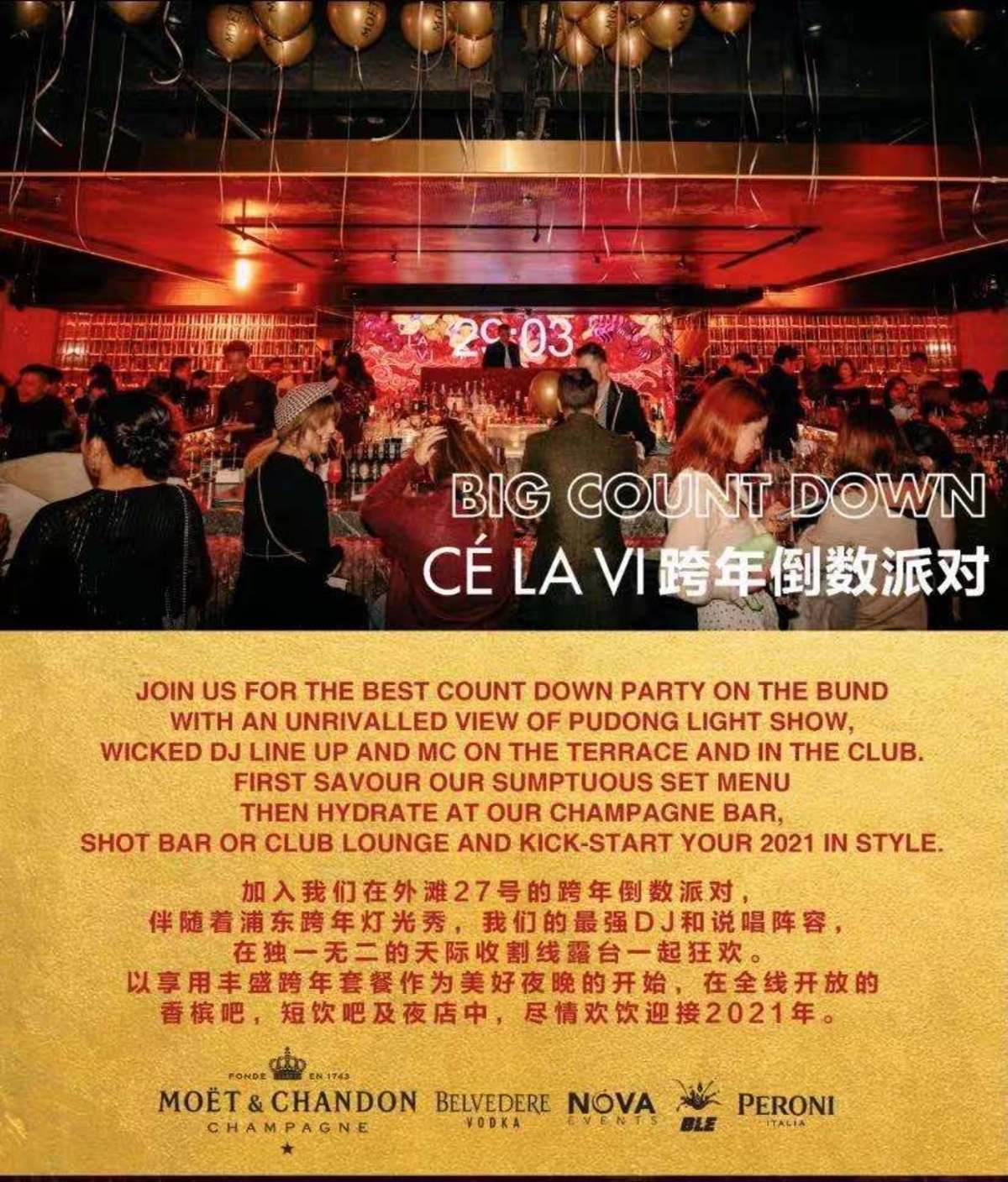 2020年12月31日 星期四 17:30 至 2021年1月1日 星期五 03:00 CeLaVi 27 Zhongshan Dong Yi Road, Huangpu