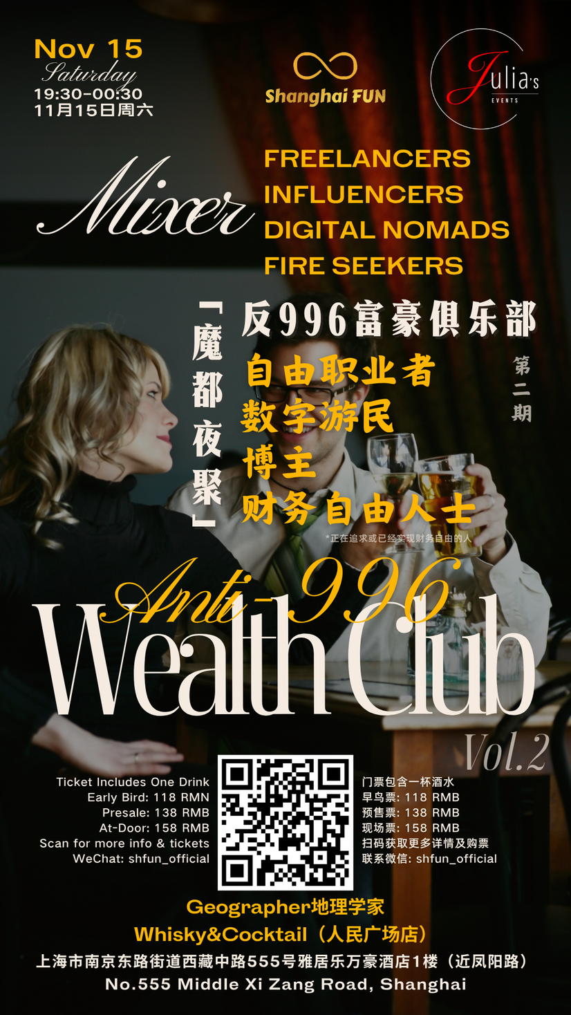 【11.15】反996富豪俱乐部-自由职业者&数字游民&博主&财务自由人士魔都夜聚 Anti-996 Club Mixer
