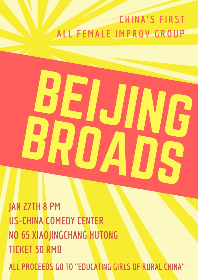 Beijing Broads is China's first all female improv group. We come from many different countries, including the UK, Spain, Argentina, Canada, Estonia etc. The broads are fierce and funny, courageous and daring. We perform in English and donate all the proceeds from the shows to an NGO called Educating Girls of Rural China.