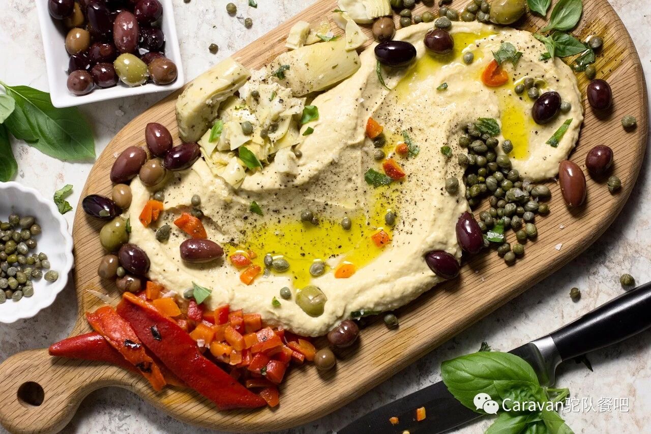 1- Moroccan Mezze Selection:hummus, shakshuka, olives, zaalook 。。。