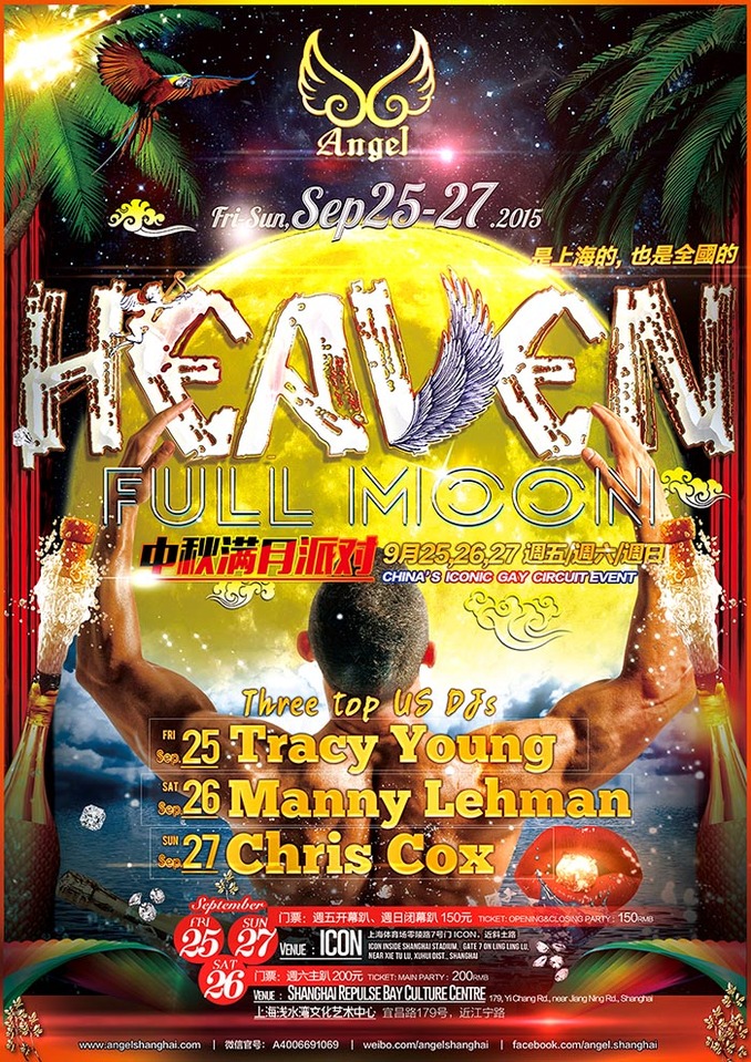 HEAVEN是中国最久负盛名的同志大趴,今年秋季派对将于2015年9月25-27日三晚在上海举办!开幕及闭幕派对在上海体育场ICON举办,主趴将在浅水湾文化中心举办!三位全美顶尖DJ Tracy Young(女), DJ Manny Lehman,以及格兰美获奖DJ Chris Cox将于中秋飞到上海,主音HEAVEN秋季大趴!本届大趴不但融汇了全美的顶尖DJ,还为您从当今欧洲各大著名派对网罗了最性感的gogo,他们将在欧洲派对季一结束便飞赴上海,为您在HEAVEN秋季大趴上带来原汁原味的,与欧洲大趴同步的性感演出!三晚四场派对,全线艺员原装进口,如此强大阵容,怎不让人翘首期盼?