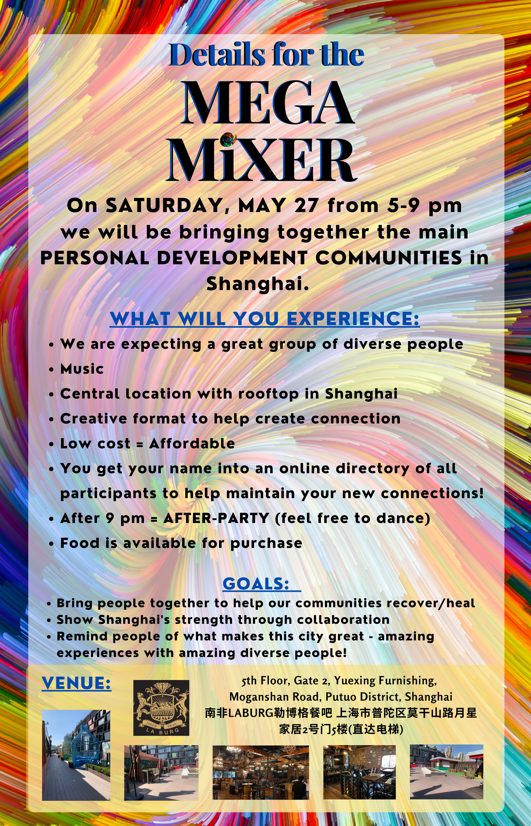 Saturday, May 27, 2023 17:00 to 23:45 5th Floor, Gate 2, Yuexing Furnishing, Moganshan Road, Putuo District, Shanghai 南非LABURG勒博格餐吧 上海市普陀区莫干山路月星家居2号门5楼(直达电梯)