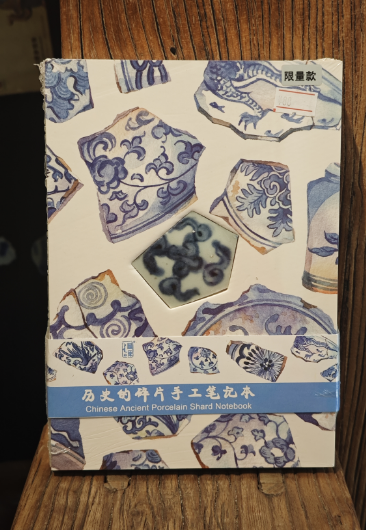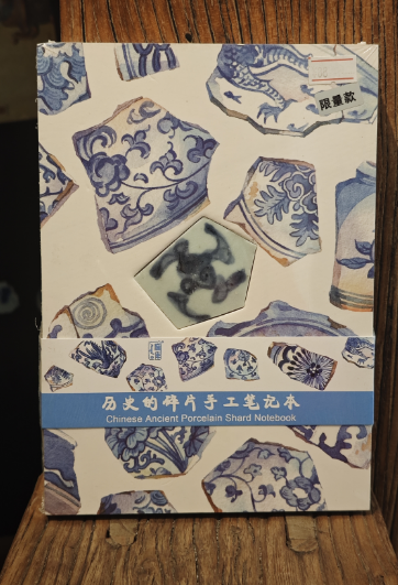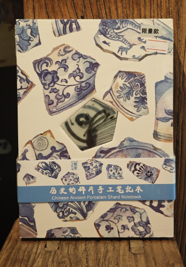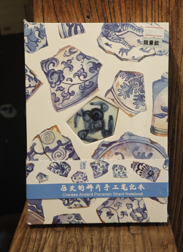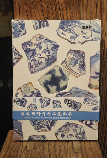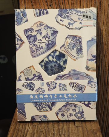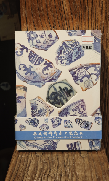 这款笔记本的独特之处,首先在于本子正面中心位置镶嵌的那一枚真正的古代陶瓷碎片。每一片陶瓷碎片,都曾是明清时期精美瓷器的一部分,它们或许见证过繁华的市井生活,或许陪伴过文人雅士的吟诗作对,岁月在它们身上留下了独特的痕迹,每一道纹路、每一处磨损都是历史的印记。而且,每一枚古陶瓷片都是独一无二的,当你的指尖轻轻拂过这枚陶瓷碎片,仿佛能跨越时空,感受到几百年前的温度与故事。