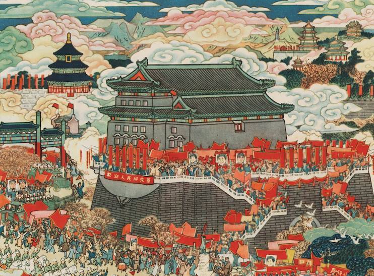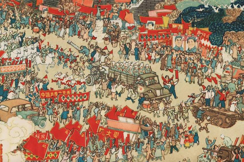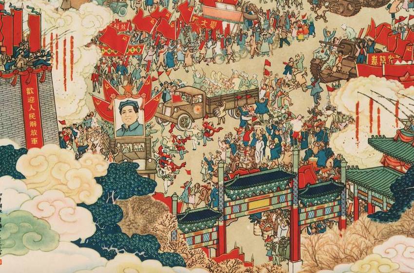 Many more details can be found in the picture, like American made jeeps, nationalist soldiers left behind, people dancing the traditional Yangge dances and much more.