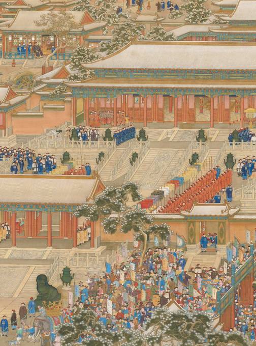 Princes can be seen lighting fire crackers in the inner most chambers of the forbidden city as the picture depicts the Imperial court celebrating Chinese New Year