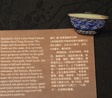 简介:唐鸳鸯莲瓣纹金碗共出土两件,两碗造型、纹饰均相同。纯金质,锤碟成形,錾刻为纹,造型饱满庄重。侈口,弧腹,圜底,喇叭形圈足。器壁捶作出上下两层向外凸鼓的莲花瓣纹,每层十片,上下轮廓相合。每一个莲瓣单元里都錾刻有装饰图案,上层主题是动物纹,有鸳鸯、野鸭、鹦鹉、狐狸等。下层是单一的忍冬花装饰图案。莲瓣上空白处装饰飞禽和云纹。鱼子纹底。 两碗内壁分别墨书“九两半”、“九两三”,应是碗的重量。墨书标重显示两碗重量略有差异,但天平实测重量相同。