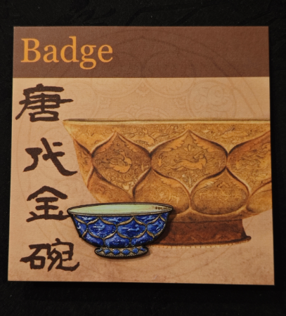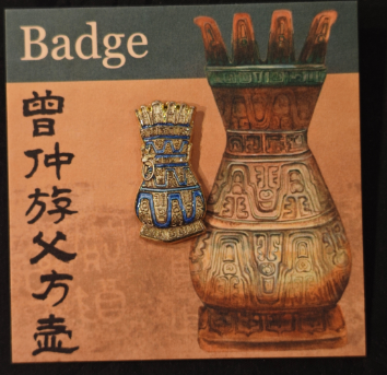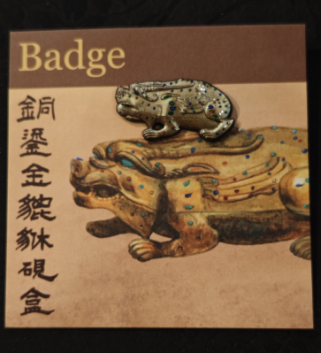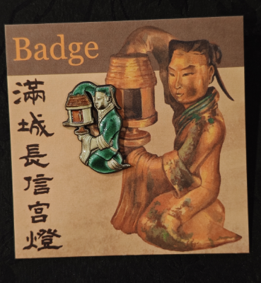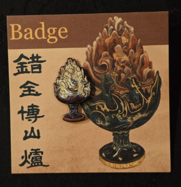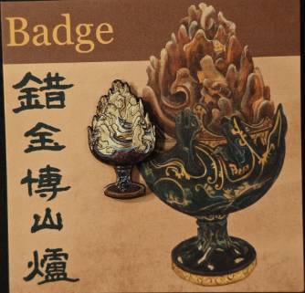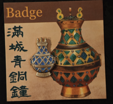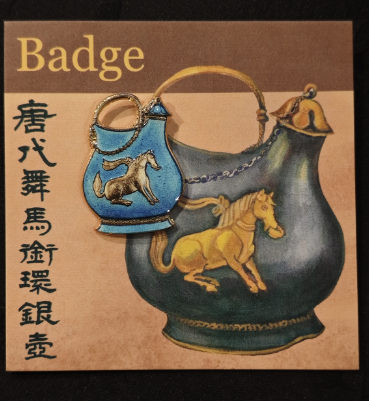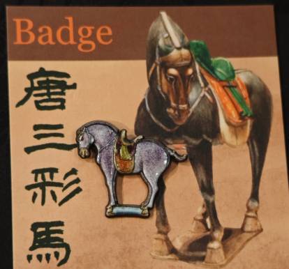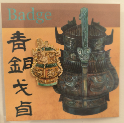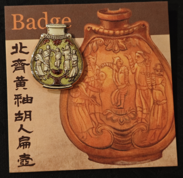 中国出土文物系列徽章 : 北齐黄釉胡人扁壶——汇通四海 错金博山炉——智博云天 满城长信宫灯——仕途永明 满城青铜壶——基业永固 唐三彩马——马到成功 铜鎏金貔貅砚盒——纳财聚宝 唐代金碗——金碗聚财 唐代舞马衔杯银壶——功成衔瑞 曾仲斿父方壶——博古铭鼎 青铜戈卣——祥戈佑宁