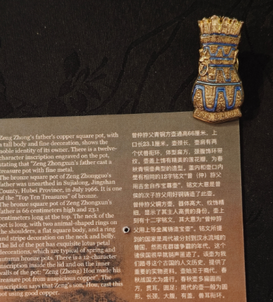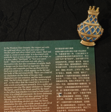 另一件出土青铜器,错金银鸟篆文铜壶,青铜壶周身用纤细的金银丝镶嵌出鸟篆文字和动物纹带。壶的口、肩、腹、足部各有纹带一周,上嵌怪兽和云雷纹。壶盖呈弧面形,上有三环纽,口微侈鼓腹,腹上饰一对铺首衔环,圈足。盖中心饰一条蟠龙,肩、腹宽带纹上饰龙虎相斗图案。壶盖错铭文“有言三,甫金,为荃盖,错书之”。颈部有铭文“盖圜四缀,仪尊成壶”。上腹错铭文“盛兄盛味,於心佳都,渰於”。下腹部有铭文“口味,充润血肤,延寿却病,万年有余”。铭文连读是一章四言韵文,大意为:圆盖四周饰有文字和花纹,是个尊贵完美的壶。不论盛水还是盛酒,都是一种心情上的享受。饮酒不仅可以享受飘飘欲仙的感觉,而且还能疏通血脉,滋润肌肤,使人延年去病,长命百岁。