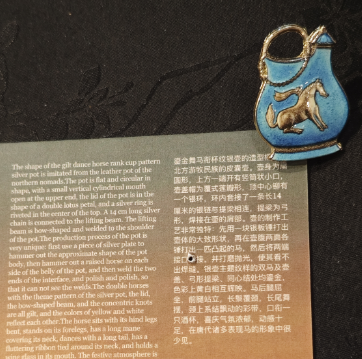 简介:壶身呈扁圆形,鎏金提梁位于壶身上部,壶口处倒扣莲花瓣形壶盖,14厘米长的麦穗式银链将壶盖与提梁相连。壶腹两侧各模出两匹骏马形象, 马口衔有一只酒杯,身躯健硕,长鬃披颈,前肢蹦直,后肢弯曲下蹲。提梁、壶盖以及壶身骏马均鎏金,与银白色壶体交相辉映,格外和谐富丽。壶底与圈足相接处有“同心结”图案,圈足内墨书“十三两半”,标示重量。2002年被列入《首批禁止出国(境)展览文物目录》。
