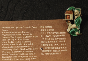简介:该宫灯还有“长信”字样,因曾放置于窦太后(刘胜祖母)的长信宫内而得名,故名“长信宫灯”。汉代的铜灯多是动物造型,长信宫灯是目前所见唯一 一件汉代人形铜灯。宫灯灯体为一通体鎏金、双手执灯跽坐的宫女,神态恬静优雅。灯体通高48厘米,重15.85公斤。长信宫灯设计十分巧妙,宫女一手执灯,另一手袖似在挡风,实为虹管,用以吸收油烟,既防止了空气污染,又有审美价值。其环保理念体现了古代中国人民的智慧,长信宫灯被誉为“中华第一灯”。