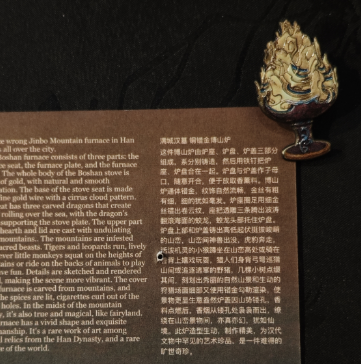 简介:熏香用具,由炉身、炉盖、柄及底座组成。炉身为半圆形,上部及盖作尖锥状山形,层峦叠嶂,炉盖因山势镂孔,雕塑出生动的山间景色,山峦间有人物、走兽出没。炉身下承短柄及喇叭形座,炉柄透雕成三龙出水状,以龙头擎托炉盘。通体满布错金纹饰,炉体饰云气纹,线条圆转,与起伏的山峦相融合,富于灵动之气。柄、座错以细丝线,底缘饰金地卷云纹。此炉汇合仙山、大海、神龙、异兽等多种元素,不仅反映出汉代人求仙和长生的信仰体系,也体现了大汉王朝“包举宇内,囊括四海”的胸怀与气度。工艺精湛,装饰华美,举世闻名,高超的铸造技艺充分诠释了盛世时期汉代工匠高度的智慧和非凡的创造力。
