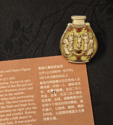 简介:1971年3月,河南省安阳县洪河屯村群众在进行农田基本建设时,发现一单室土穴墓。从出土的一盒墓志确定墓主为北齐高级将领范粹(548~575年),墓中出土随葬器物77件,黄釉扁壶有4件。该壶形体扁圆如皮囊,敞口,短颈,扁圆腹,平底实足,两肩各一系孔,颈肩之间饰联珠纹一周。 壶腹两面模印乐舞图案,考证乃是风靡当时的“胡腾舞”,它是一种源于中亚地区的舞蹈,随着丝绸之路传入中原,在北朝至唐代风靡一时,对中原的传统乐舞文化产生了深远影响。