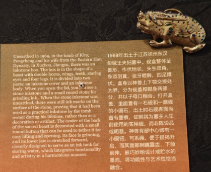 简介:整体呈兽形,作伏地状,砚盒整体以铜铸成一神兽,形似一只匍匐爬行的蟾蜍。头生双角,身添羽翼,张牙瞪眸,四足蹲伏。盒身以神兽上下颚交接处为界,分为砚盖和砚身两部分,上部为盖,包括从头部的上颔、背、及尾部;下部为底座,包括从头部的下颔,腹及腹下四足。并以子母口相合。 打开盒盖,里面置有一石砚和一磨砚的小圆石,出土时,石砚表面尚留有墨痕,证明其为墓主人生前使用的实用砚。神兽头部似龙形,生有双角,双目呈三角形,睁目凝视,两眉突起。腹部微鼓且饰有双翼,张口嗔目,状极凶悍,形象生动具体。造型设计方面既有写实的手法,又有夸张的成分。砚盒整体设计精巧,神兽背部中心饰有一小圆钮,可系绳,便于提揭开启,而其面部咧嘴露齿、下颌前伸,被巧妙地设计成贮水的墨池,将功能性与艺术性恰当融合。盒身表面则以鎏金银工艺满饰全身,出土时金银色泽光亮均匀,虽在地下已历近两千年而不褪色。除鎏金银工艺外,盒身还均匀镶嵌绿松石、青金石、玛瑙等各类宝石。器表纹饰交相辉映,是汉代鎏金银与镶嵌工艺的完美结合。