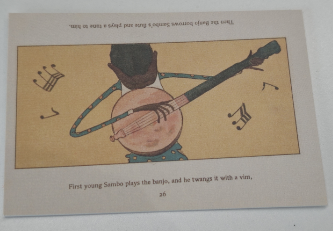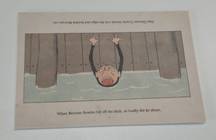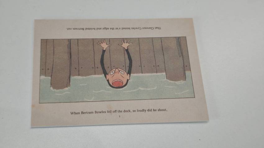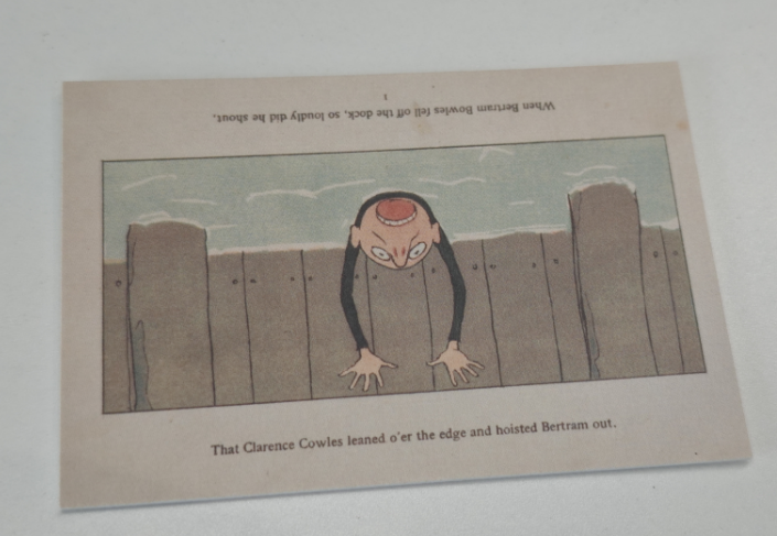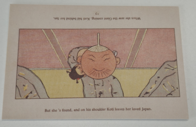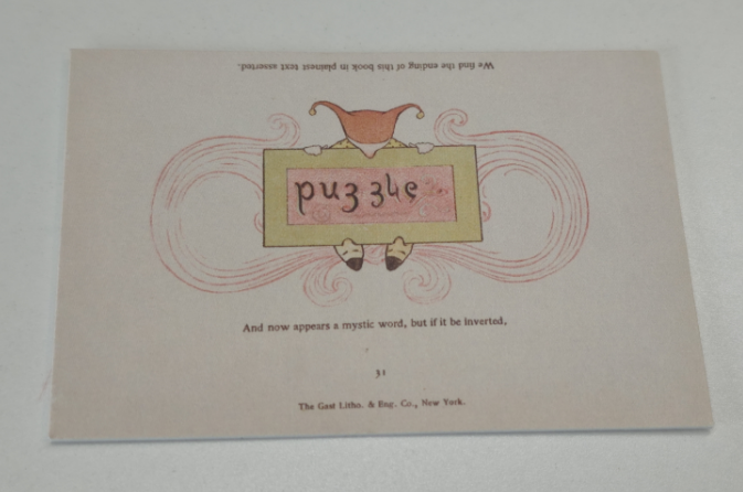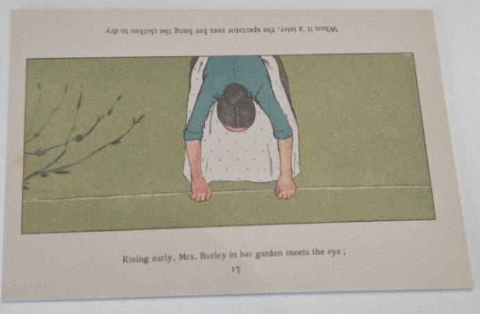 这是一本互动式的图书,由美国画家彼得·纽维尔(Peter Newell)于1893年写成并出版。它巧妙地利用视觉错觉插画和押韵的注释来塑造一种很神奇的阅读体验。这本魔书的每一页都有一个画像和两段一正一反的注释。把书页180°反转后,画像会展现出截然不同的一幅场景,原本像是乱码的倒置文字也显出了“原形”;上下的图片互补、注释押韵,讲述着一个个独立而十分吸引人的小故事。这本书把作者无限的想象力和创造力提现的淋漓尽致。
