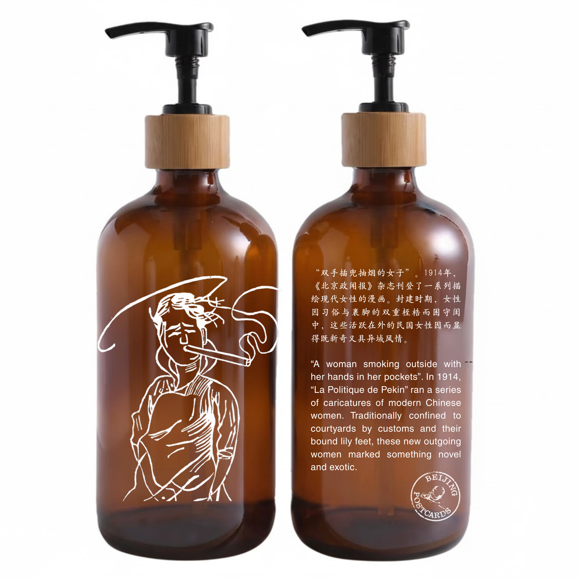 “A woman smoking outside with her hands in her pockets”. In 1914, “La Politique de Pekin” ran a series of caricatures of modern Chinese women. Traditionally confined to courtyards by customs and their bound lily feet, these new outgoing women marked something novel and exotic.