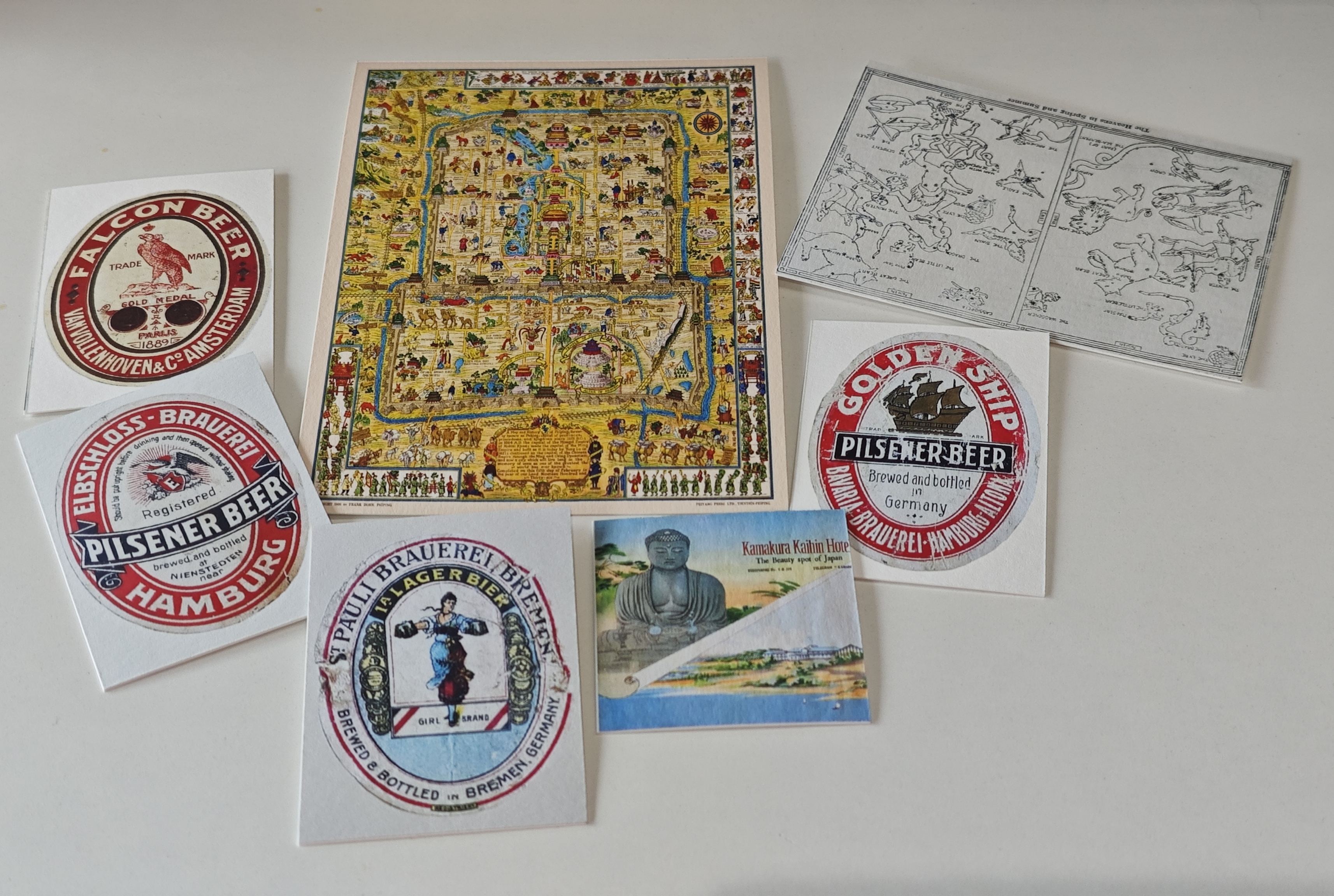 1936年北平风俗地图,19-20世纪德国、荷兰的啤酒标签,日本镰仓海滨公园海岸风光,19世纪西方古典星图……这组物件是跨地域、跨时代的复古纸品收藏,涵盖了:中国民国时期的城市民俗记录;欧洲近代啤酒工业的品牌视觉史;日本近代旅游与宗教文化的视觉表达;西方古典天文学的艺术化呈现。